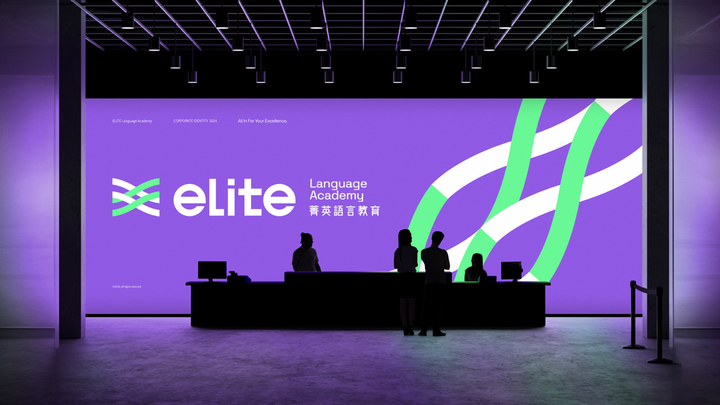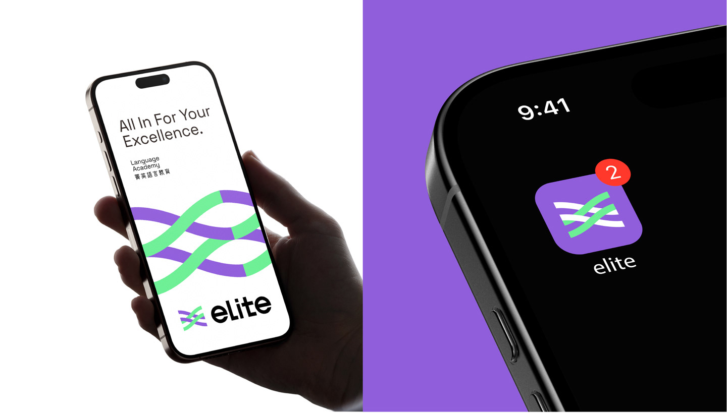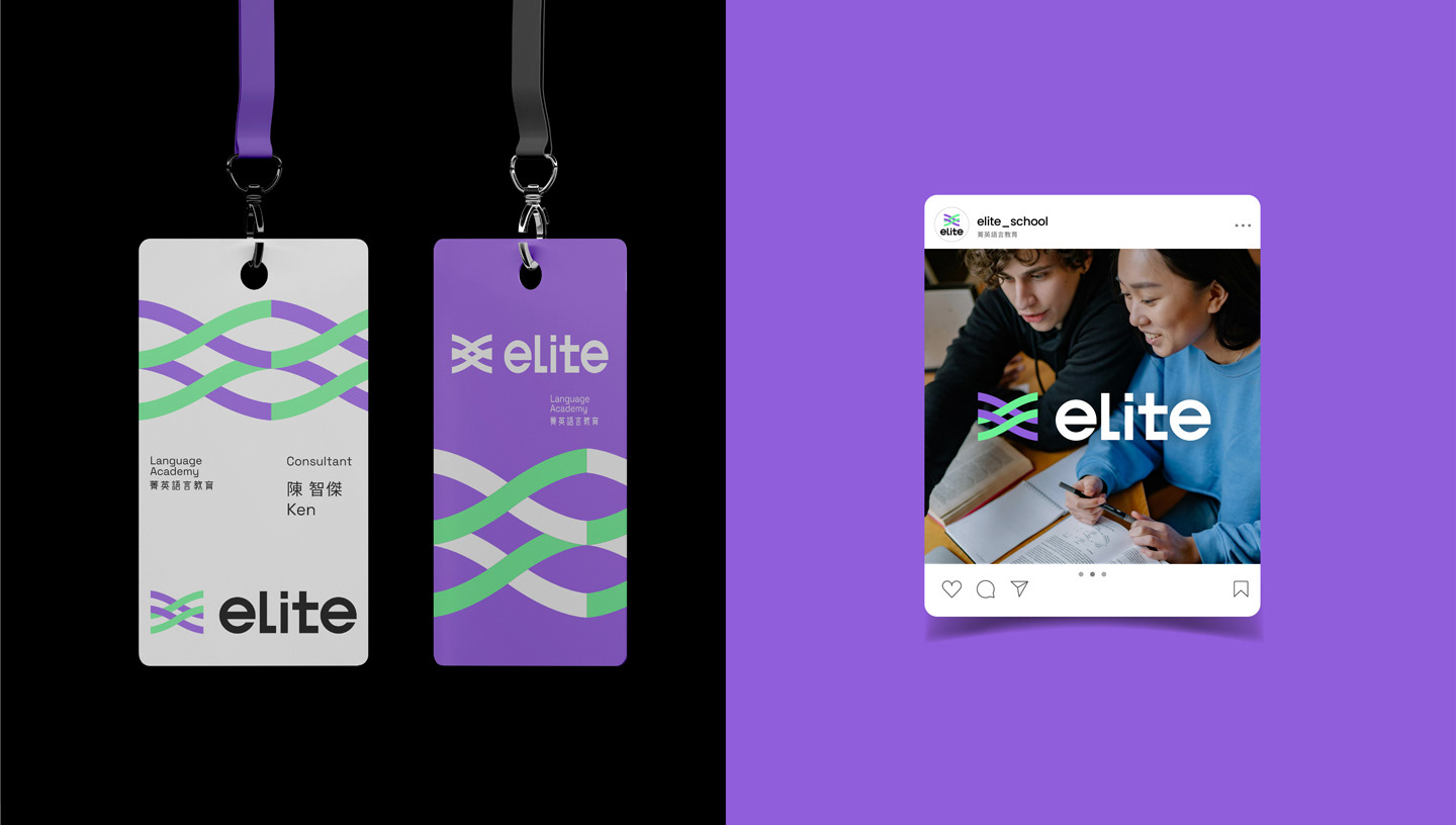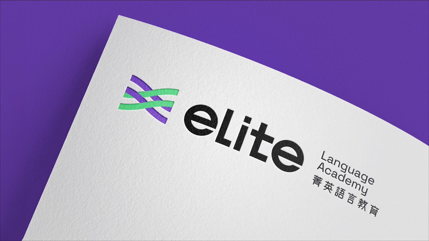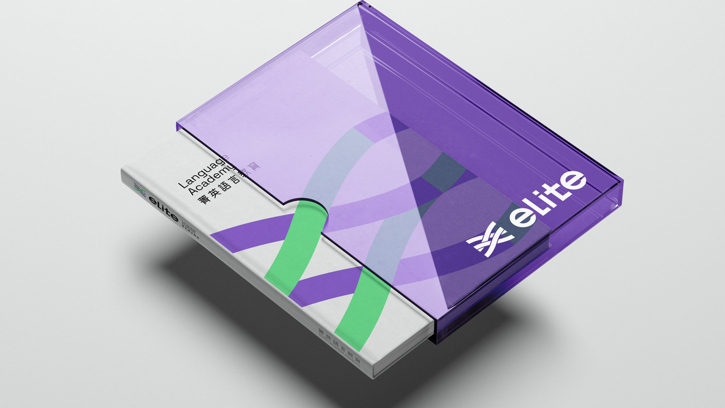 The logo is composed of two interwoven lines, symbolizing ELITE’s transformation from leading the way to running alongside its learners. It represents a step-by-step, hands-on approach that guides students through their growth journey, reflecting the spirit of co-creating excellence. The bright purple carries forward the brand’s sense of professionalism, while the digital-inspired green conveys ELITE’s energetic and positive personality. The intertwined lines also represent the brand’s hybrid learning strategy, integrating online and offline education to help learners achieve outstanding results. The brand logotype features a customized sans-serif typeface. The use of lowercase English letters gives a warm and approachable feel, while the tall, slim structure and simplified strokes create a clean and youthful appearance. The Chinese characters combine rounded exteriors with square interiors, reflecting ELITE’s human-centered values as well as its reliable, professional brand identity.
