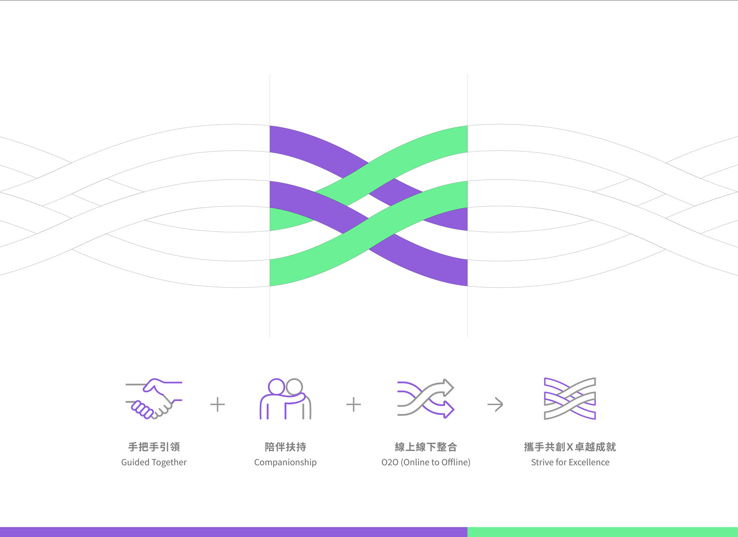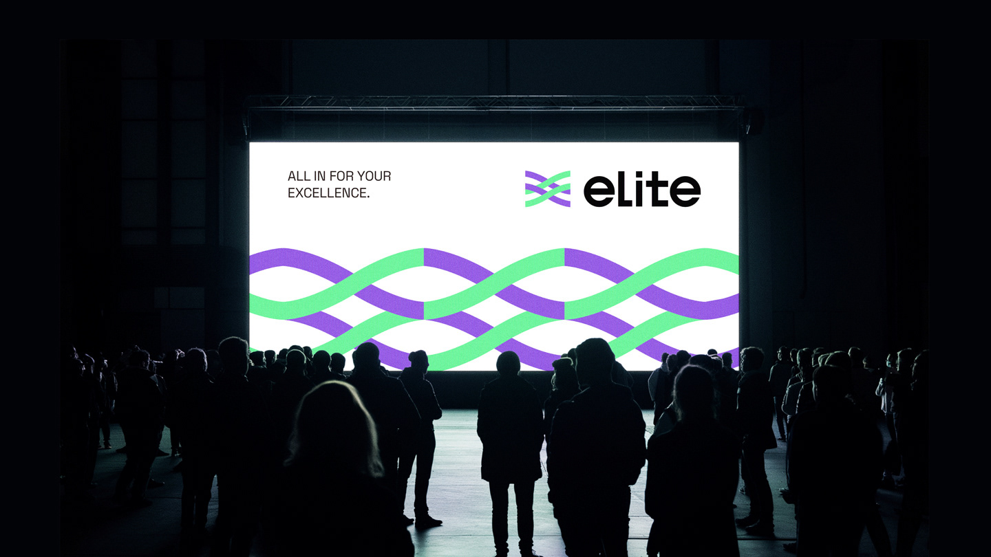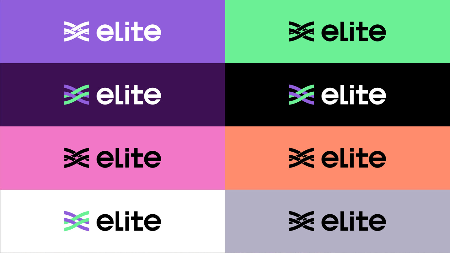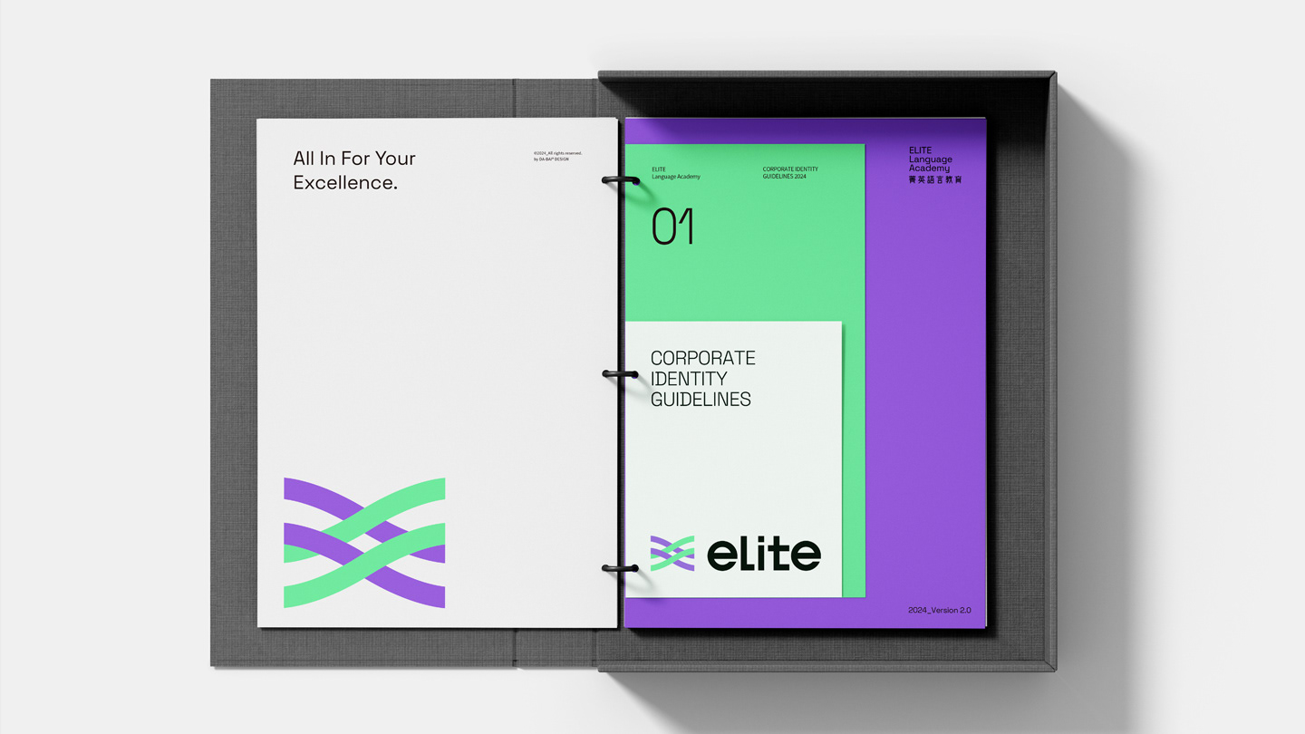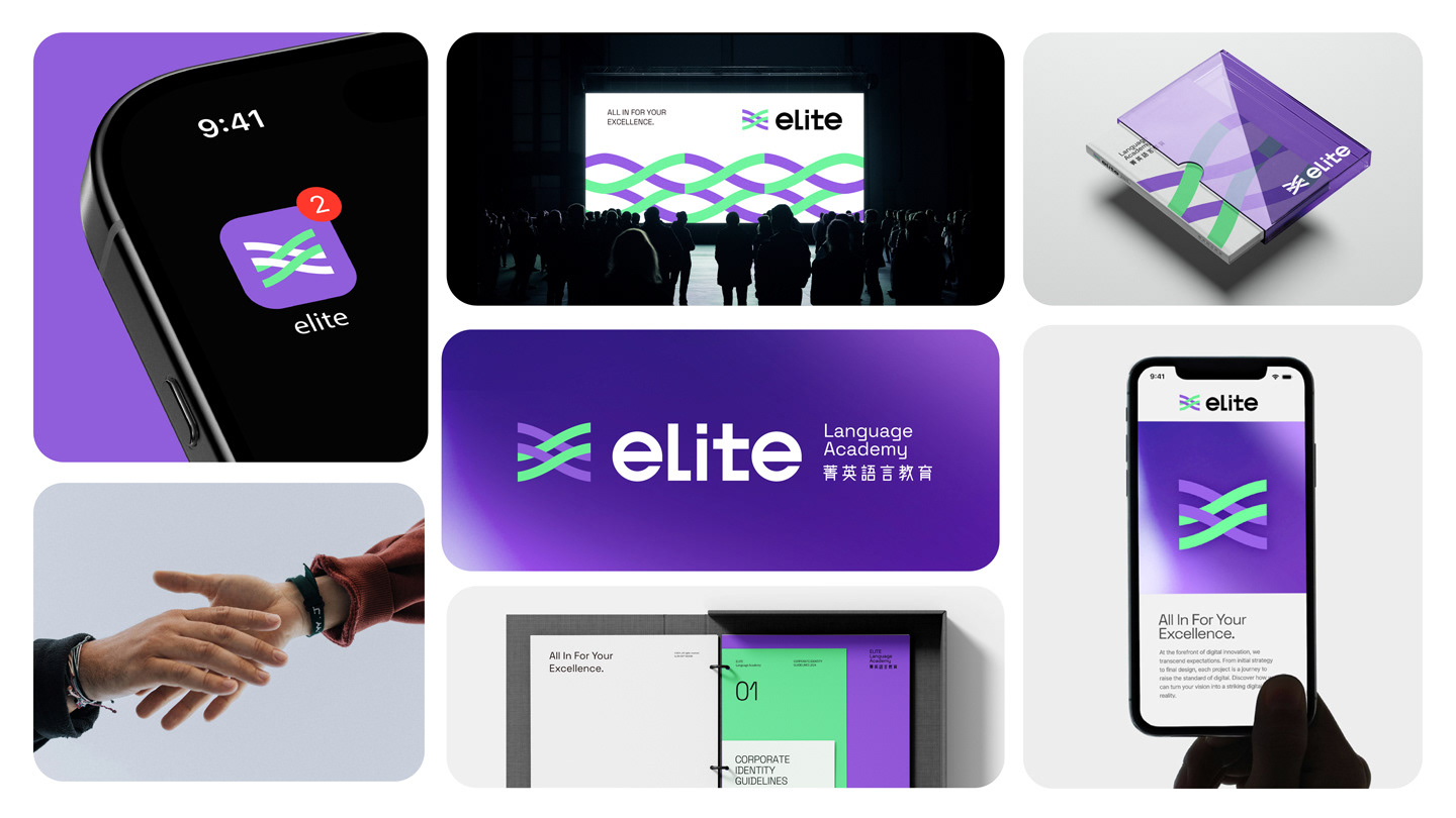 The logo is composed of two interwoven lines, symbolizing ELITE’s transformation from leading the way to running alongside its learners. It represents a step-by-step, hands-on approach that guides students through their growth journey, reflecting the spirit of co-creating excellence. The bright purple carries forward the brand’s sense of professionalism, while the digital-inspired green conveys ELITE’s energetic and positive personality. The intertwined lines also represent the brand’s hybrid learning strategy, integrating online and offline education to help learners achieve outstanding results. The brand logotype features a customized sans-serif typeface. The use of lowercase English letters gives a warm and approachable feel, while the tall, slim structure and simplified strokes create a clean and youthful appearance. The Chinese characters combine rounded exteriors with square interiors, reflecting ELITE’s human-centered values as well as its reliable, professional brand identity.