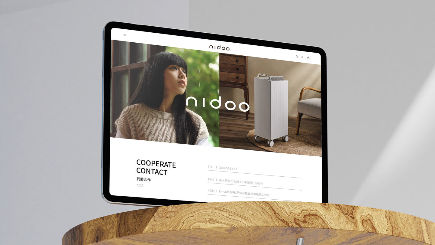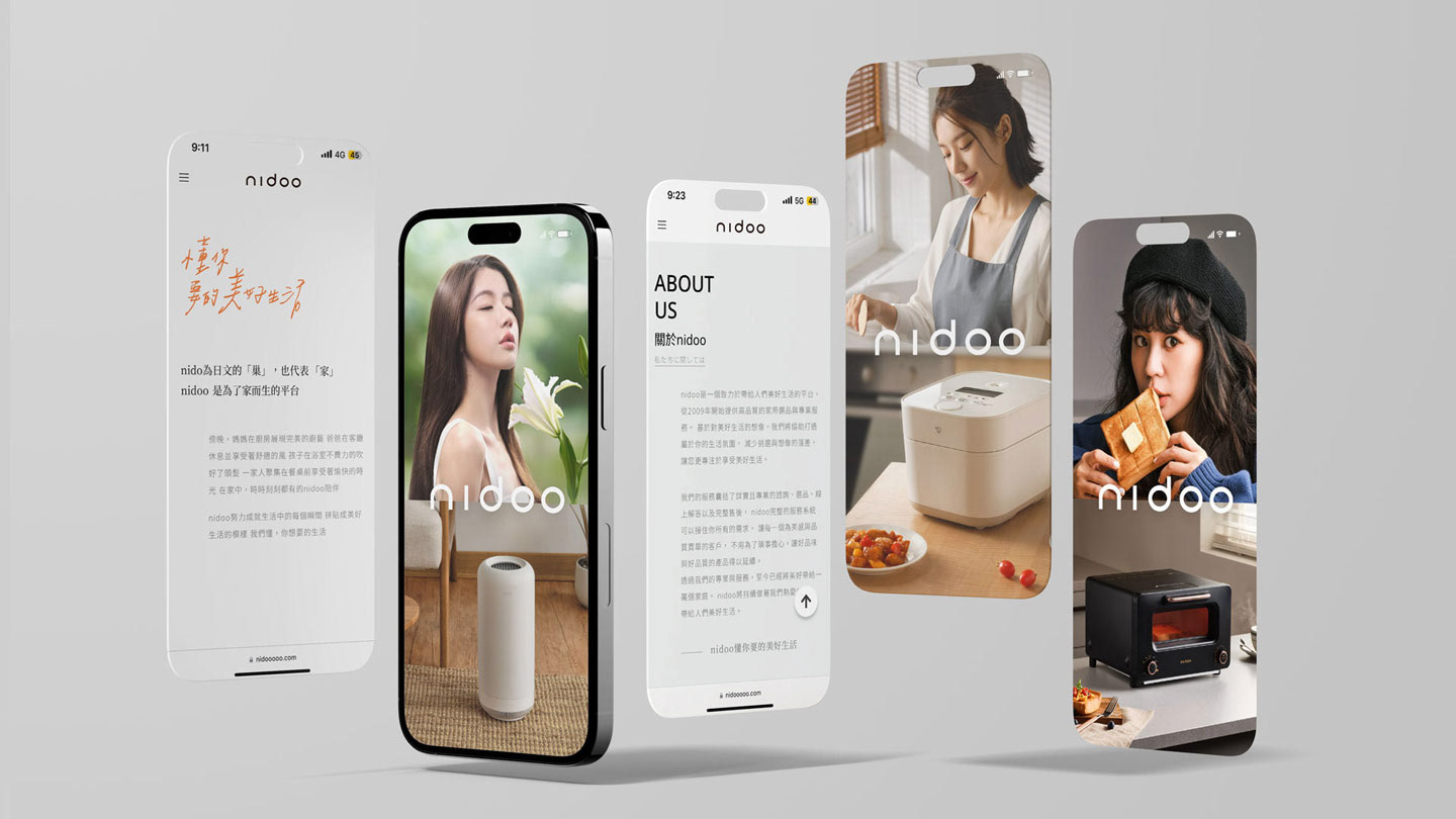 nidoo is a home appliance brand dedicated to enhancing people's lives. The brand rebranding project included naming, brand identity, logo, key visual, photography, web visual, and layout, among other elements, and has successfully helped the client establish an overall brand tone and differentiation.