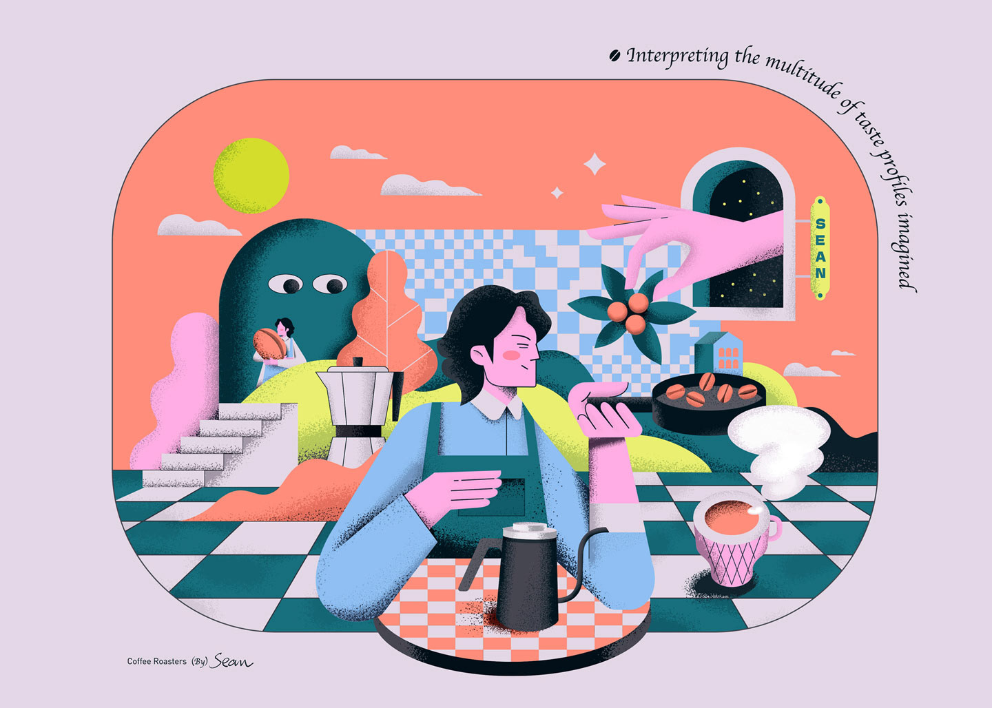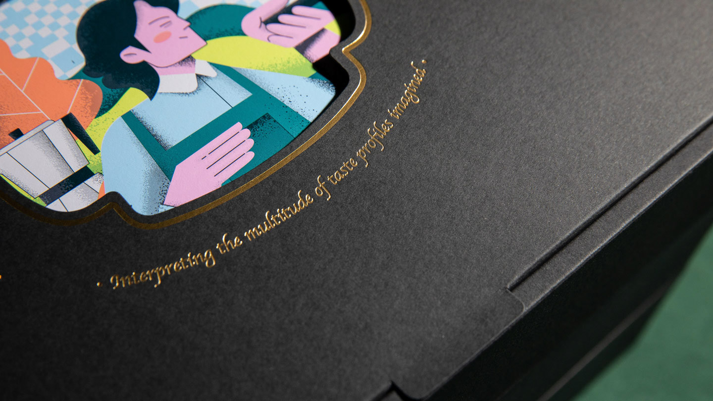 一杯好的咖啡始於一顆好的豆子,咖啡之所以令人著迷,是因為小小一粒豆子,卻蘊藏豐富且多變的風味。山咖啡® 以單一豆種少量新鮮烘焙,從產地的選擇到逐顆豆子的嚴格篩選,堅持不使用商業豆,專屬的多工式烘焙法,使溫度均勻包裹著每粒豆子,透過精準的火候,將千變萬化的豐富韻味釋放出來,以豆子的視角、烘焙出世界。插畫透過烘焙師Sean的視角,感受”從產地到杯中”的風味之旅,以7色Pantone® 複雜的疊色印製,整體色調和咖啡質地相互呼應,給人如茶般溫暖豐厚的果香的口感,山咖啡® 詮釋味覺的多元想像。